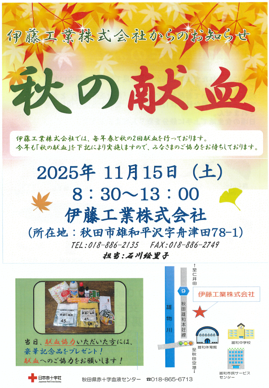 伊藤工業株式会社会議室にて秋の献血活動を実施いたします。皆様のご協力をお待ちしております!<日程>2025年11月15日(土)8:30~13:00伊藤工業株式会社 会議室